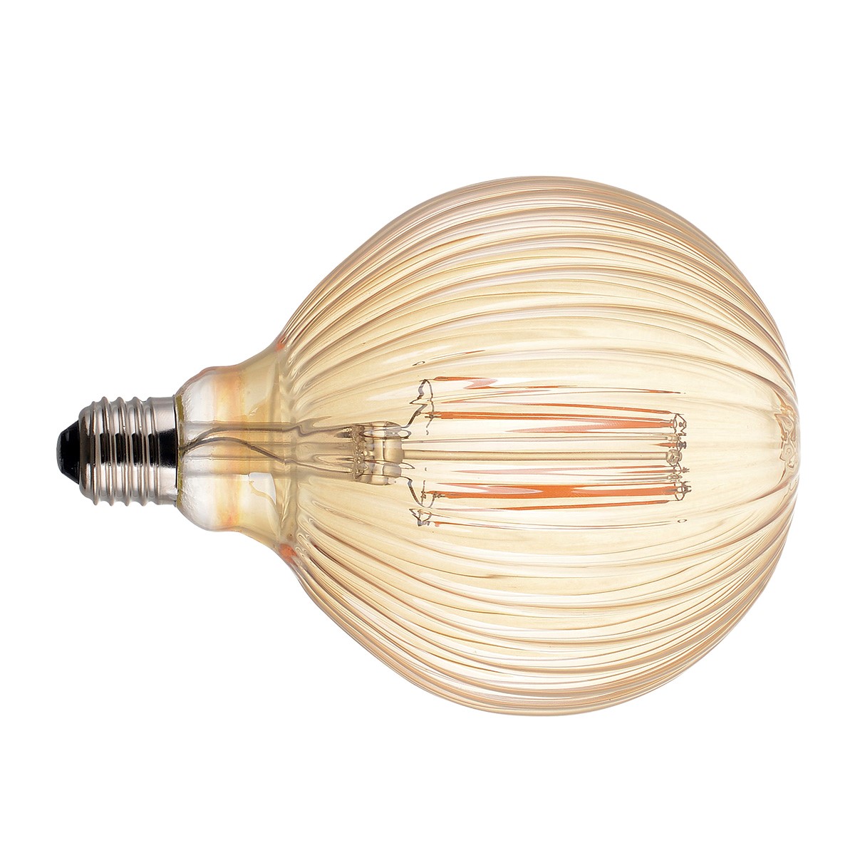 Globo decorativo de filamento LED de estilo vintage, con cristal estriado en color dorado, con diámetro de 125mm. Con una potencia de 6W alcanza los 500lm. La bombilla está pensada para quienes quieren disfrutar de una decoración vintage sin renunciar a la eficiencia de la tecnología LED. Son perfectas para las lámparas colgantes estilo retro o industrial que dejan ver la bombilla.