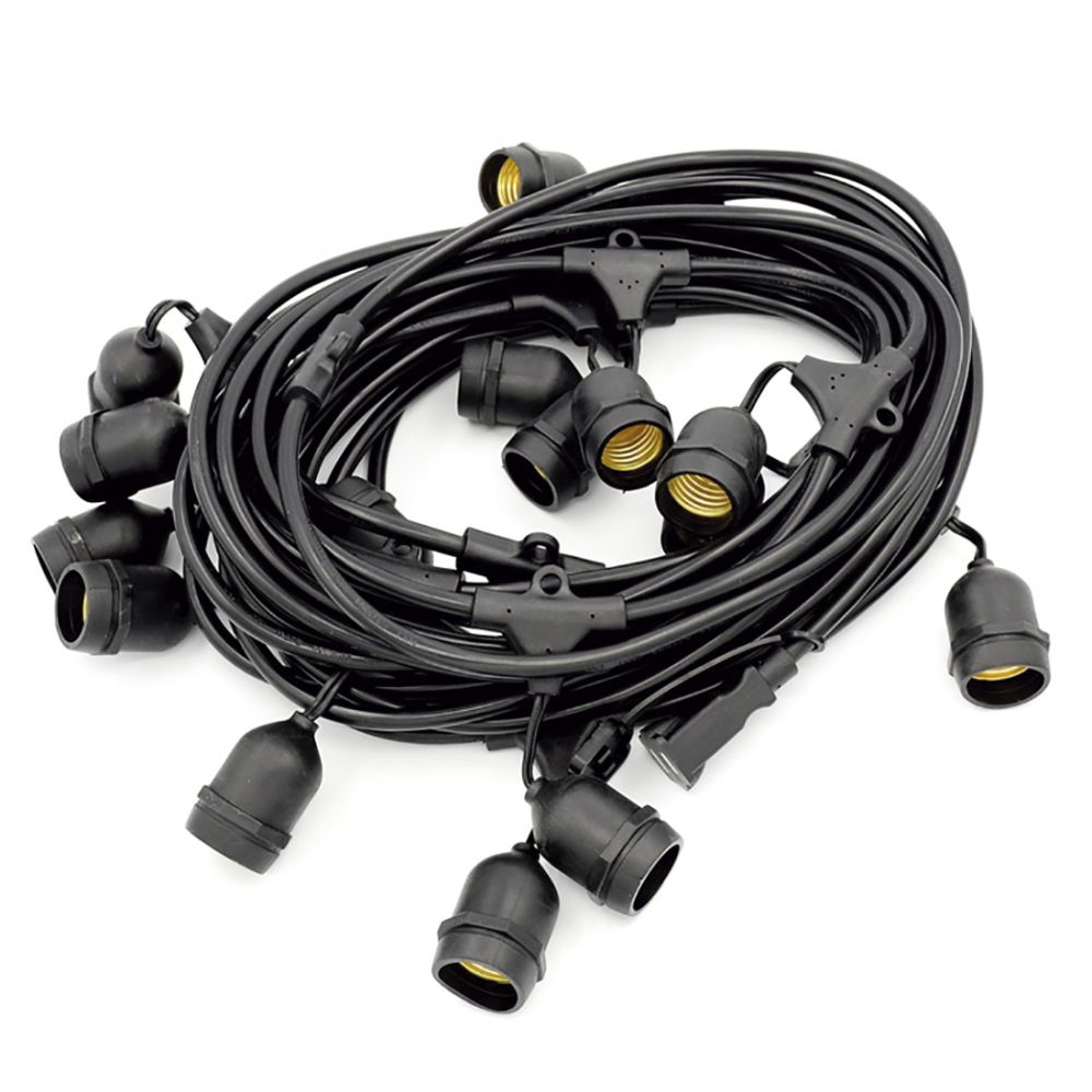Guirnalda para exteriores resistente al agua con protección IP65, de 10 metros de longitud con 10 portalámparas E27. Carga máxima: 900W. Las guirnaldas se pueden interconectar entre ellas siempre que no se sobrepase la carga máxima. El número de guirnaldas que se pueden conectar dependerá del consumo de las bombillas que se vayan a conectar. El total de lámparas conectadas no debe superar los 900W.