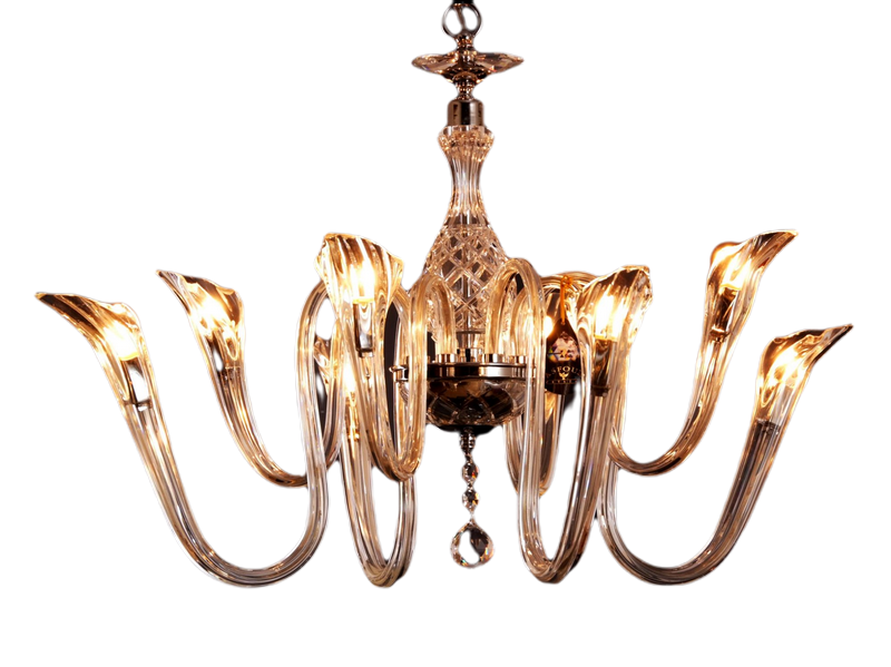 Lámpara de cristal con 8 luces y brazos con abertura en su final.