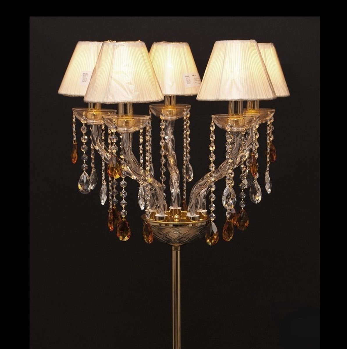 Pie de salón lámpara Mª Teresa 5/l, acabado en cromo vestido con tiras de cristal transparente y color MADE WITH SWAROVSKI ELEMENTS y pantallas plisadas.