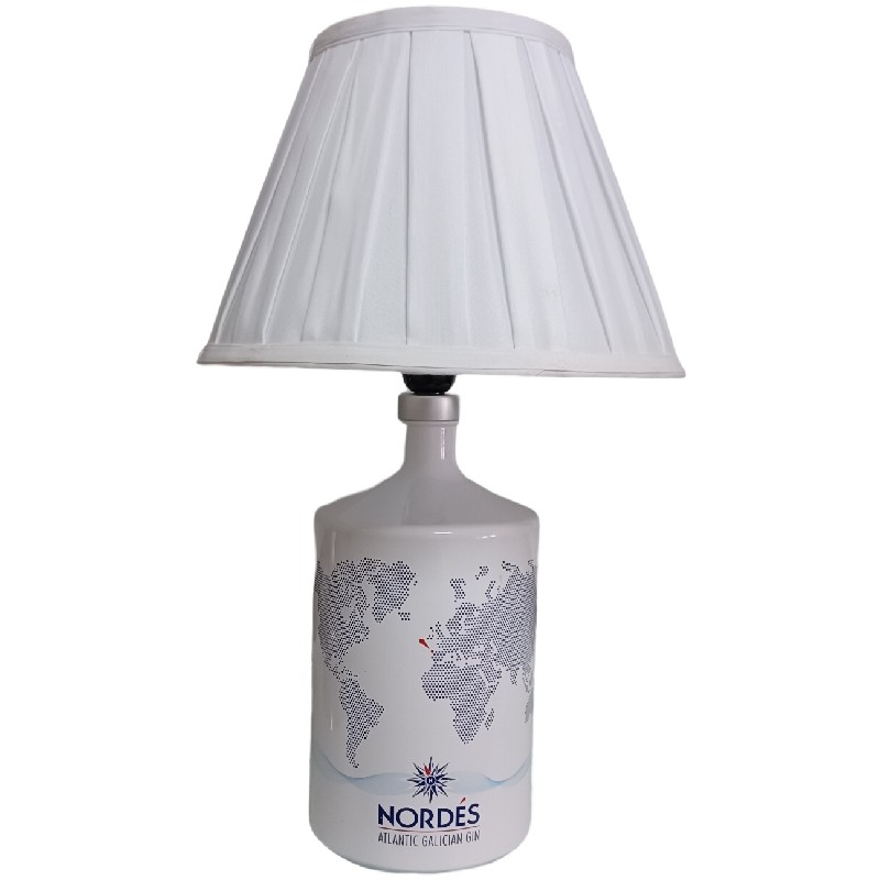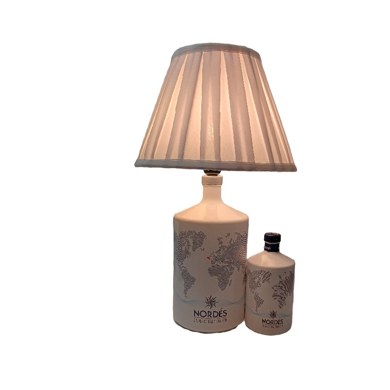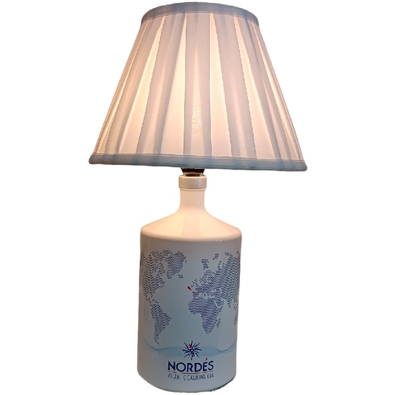 Botella iluminada de gran tamaño de ginebra premium Nordes 3L, con pantalla plisada blanca.