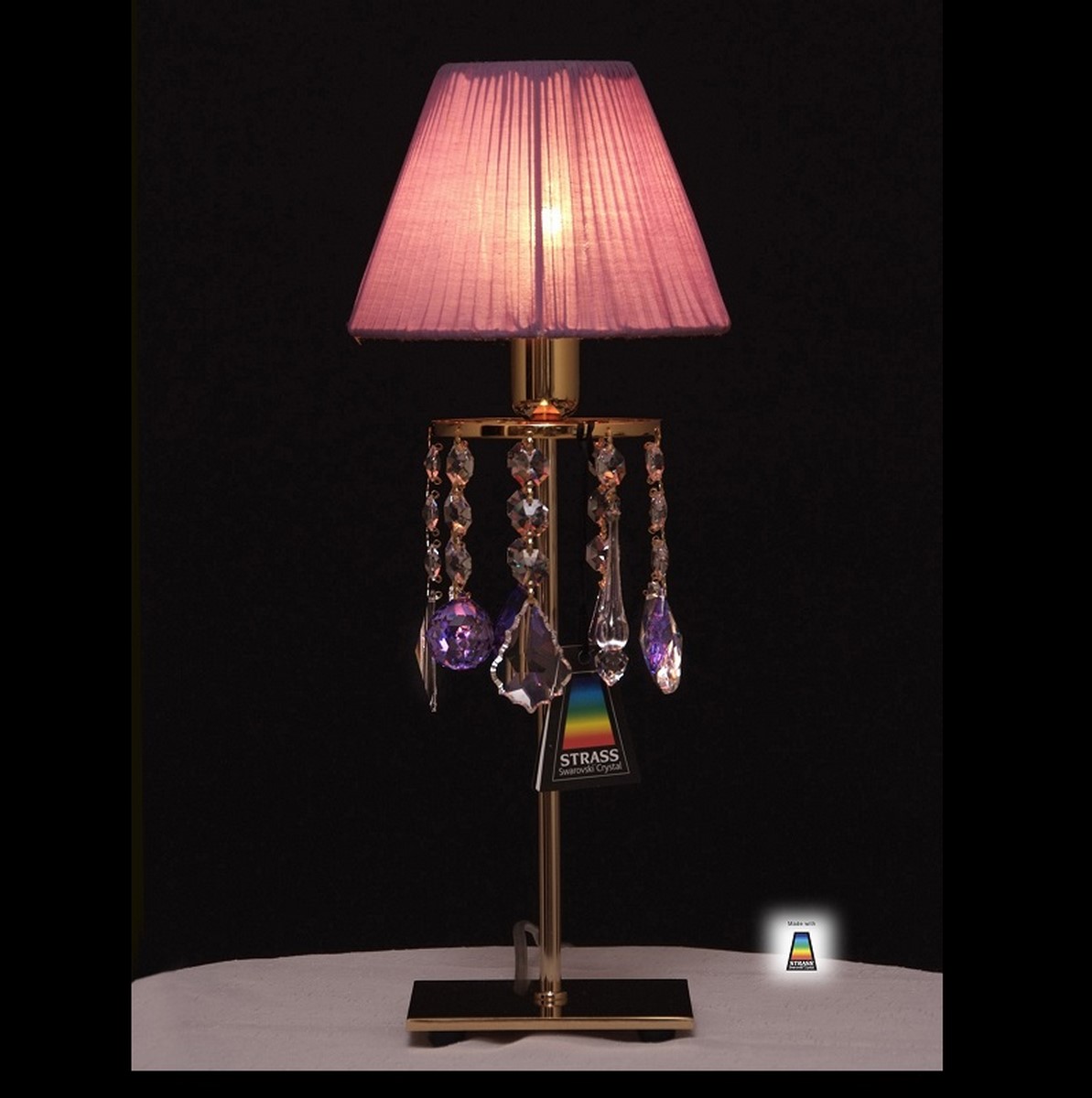 Sobremesa aro 1/L acabado en oro, pantalla plisada morada, con tiras de cristal transparente y morado MADE WITH SWAROVSKI
