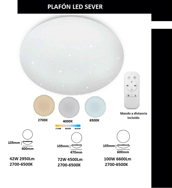 Plafón LED de superficie de alta potencia con 100w 72w y 42w que permite regular 3 temperaturas de color. Mando inalámbrico incluido. Plafón de aluminio con función modo noche.