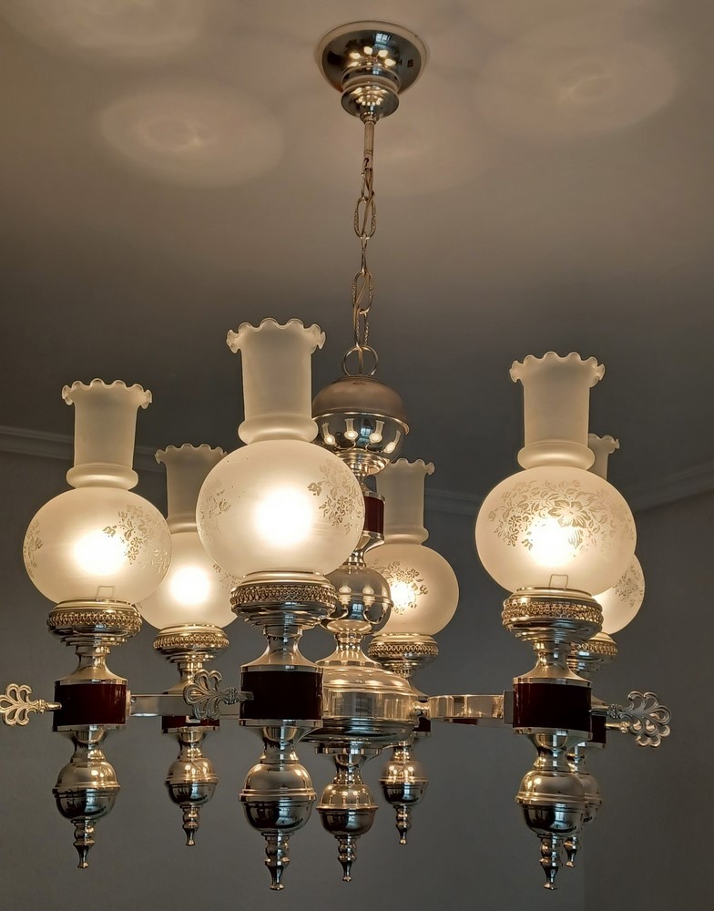 Lámpara de latón 6 luces bañado en plata con tulipa ácido.